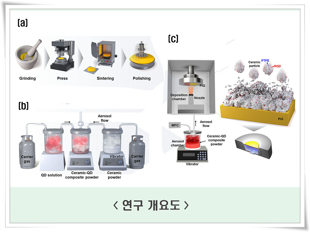 연구팀은 에어로졸 증착 기술을 이용해 상온에서 양자점과 세라믹 복합층을 직접 형성하는 데 성공했으며, 이 과정에서 세라믹 소재(Al₂O₃, SiO₂)와 함께 PTFE(속칭, 테프론) 첨가제를 도입해 증착 과정에서 발생하는 물리적 손상을 최소화하고, 발광 효율을 크게 향상시켰다.