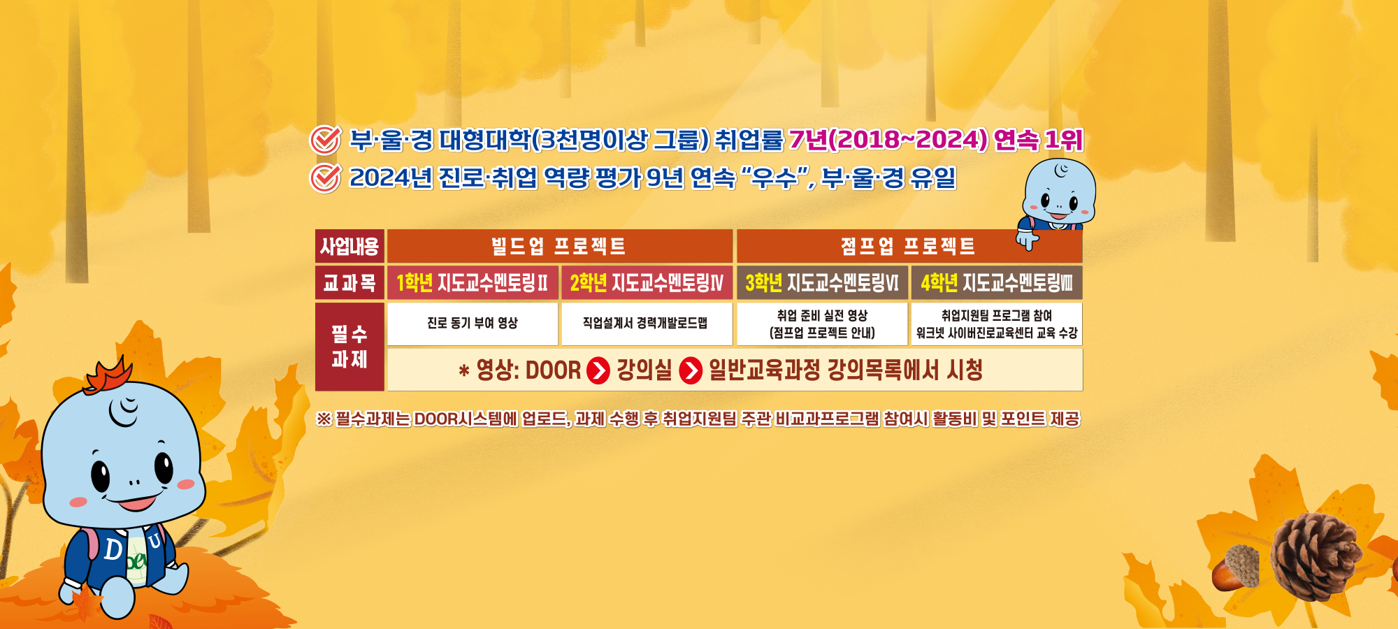 <TvN 유퀴즈 출연 '취업의 신' 특강 + 우수기업 현직자 실전 취업 멘토링>2025년 우수기업 현직자와 함께하는 "하반기 실전 취업 멘토링 DAY"유퀴즈 출연 대기업 15곳 합격 "취업의 신" 황인 자기님의 명사 특강!+ 우수기업 현직자 11인이 들려주는 취업 '리얼 스토리'일시: 2025. 9. 20.(토) 13:00 ~ 18:00장소: 국제관 2층 석당아트홀 외대상: 동의대 재학생, 졸업생, 모든 청년내용 - 1부: 취업의 신 황인 취업 특강 - 2부: 우수기업 현직자 11인의 취업 리얼스토리 (QR코드를 통해 신청)기업현황연번기업명업종소속 부서1경성산업선박, 자동차 특수 연마제인사, 총무2부산영상위원회영상산업 지원시설관리팀3삼덕통상제조업(노스페이스 등)인사, 총무4삼성전기전자부품제조인사, 총무5센디IT플랫폼(물류 중개)인사, 총무6은산해운해운물류운송수출팀7이노플특수 플라스틱, 합성수지인사, 총무8조광요턴외국계 - 선박용 특수 도료인사, 총무9코노텍전자제어기기인사, 총무10오토닉스자동화기기, 센서재무회계11한국바스프외국계 - 첨단소재, 정밀화학인사, 총무신청방법 : DAP프로그램 신청(취업특강) 후 QR을 통해 멘토링 신청 참가자 혜택: 비교과통합마일리지 10,000점 + 재학생맞춤형고용서비스사업 자기주도형 5시간 인정